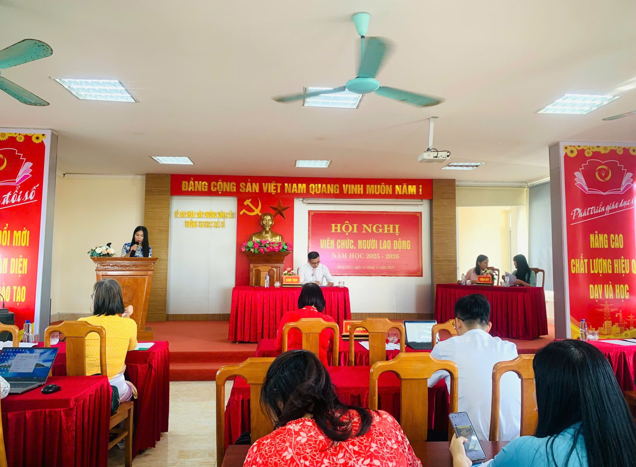 Trong không khí làm việc dân chủ, nghiêm túc và trách nhiệm, các đại biểu đã được nghe báo cáo kết quả hoạt động của nhà trường năm học 2024–2025; và các tham luận tâm huyết, đề xuất nhiều giải pháp thiết thực nhằm nâng cao chất lượng dạy học, đổi mới phương pháp giáo dục, ứng dụng hiệu quả công nghệ thông tin trong giảng dạy.![]()